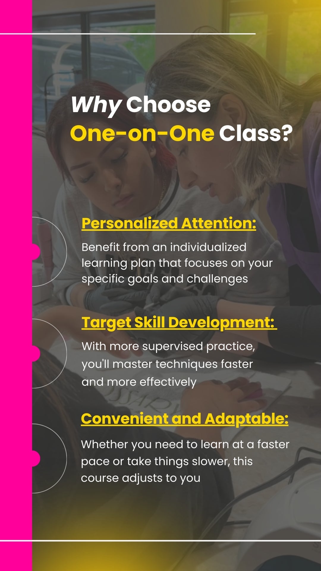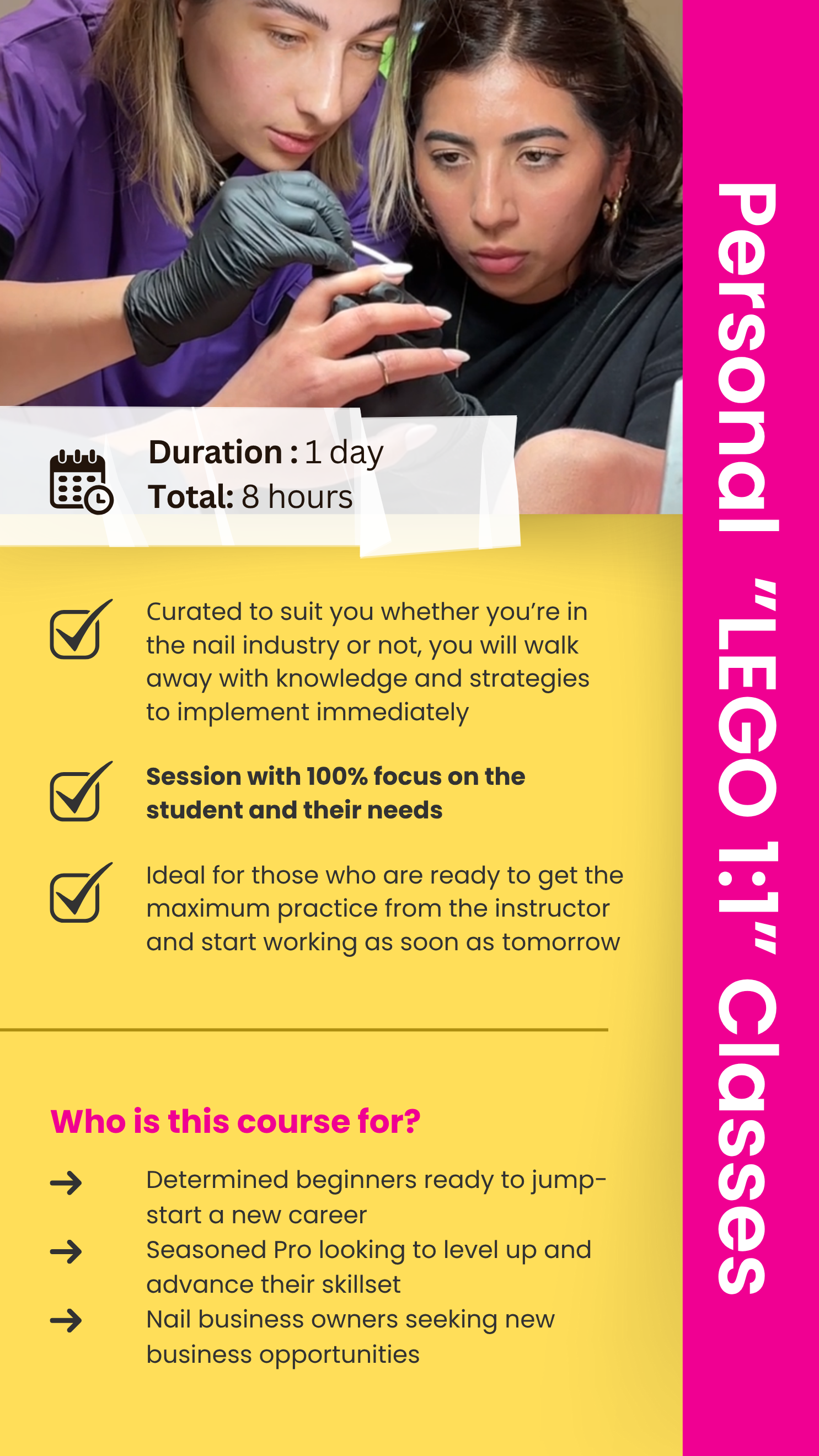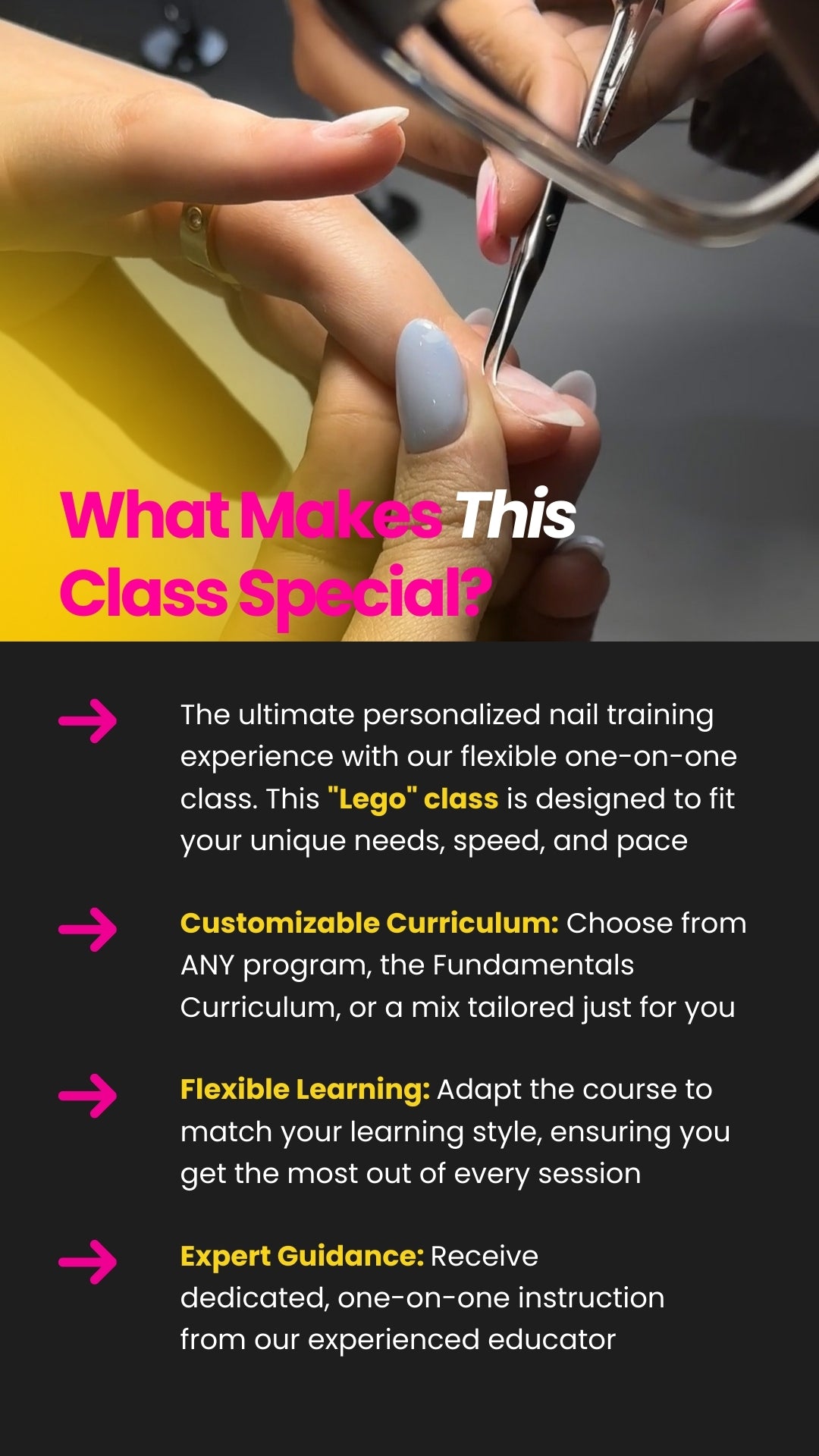 The ultimate personalized nail training experience with our flexible one-on-one class. This "Lego" class is designed to fit your unique needs, speed, and pace